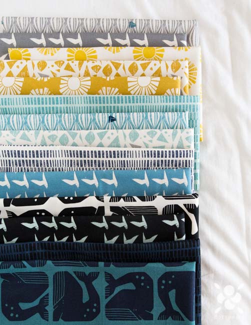 By The Seaside is designed by Aan Zee for Cotton and Steel Fabrics. By The Seaside features geometric whales in a block print style, sailboats, fish, seagulls, suns with cute little faces, and fun geometric coordinates. In a palette of black, aqua, gold, and turquoise, it’s perfect for little boys and girls who love the nautical style!