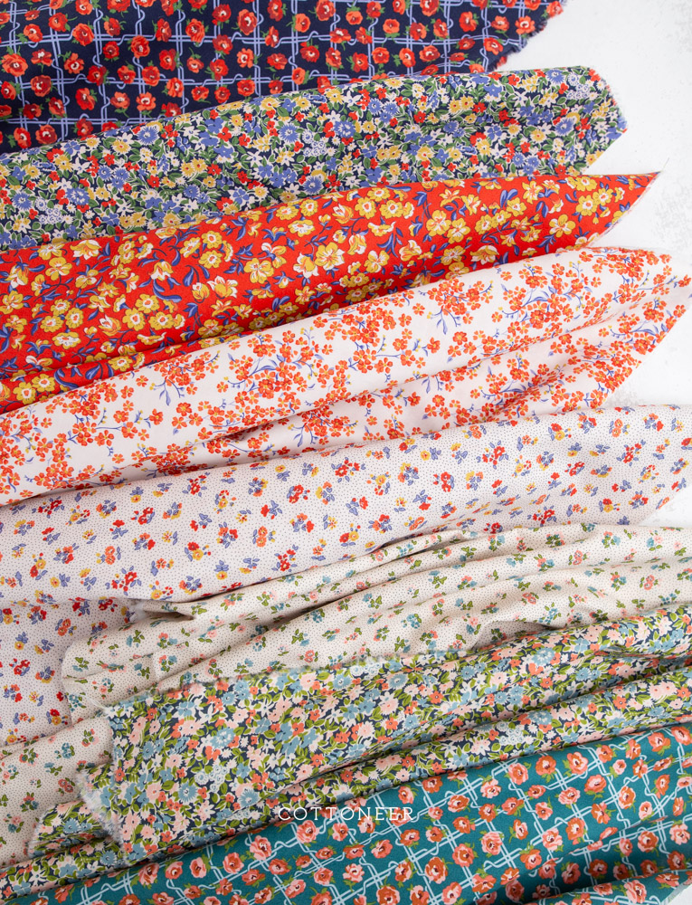 Liberty Fabrics are traditionally screen printed onto soft Lasenby cotton. This base is suited for craft projects, apparel, and classic patchwork quilting. The possibilities are as endless as your imagination. Nostalgic blooms are arranged in a dense, allover repeat pattern, creating a meadow of simplified silhouettes that evoke a sense of vintage elegance. Cottoneer carries a selection of curated fabrics from Riley Blake Designs, like these new Liberty Fabrics prints!  Find this and other Riley Blake Designs by the yard or individual fat quarters, at Cottoneer Fabrics!