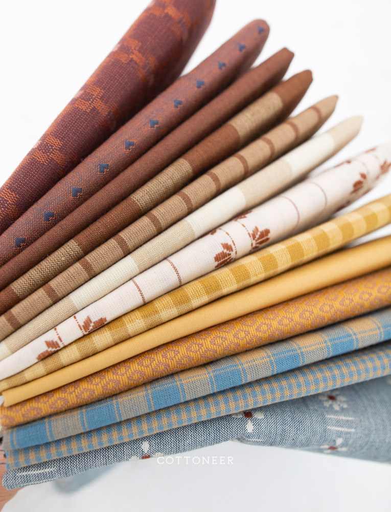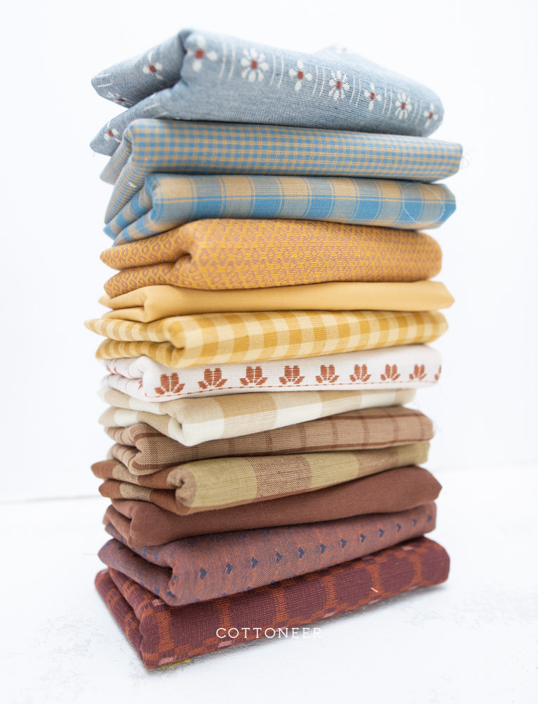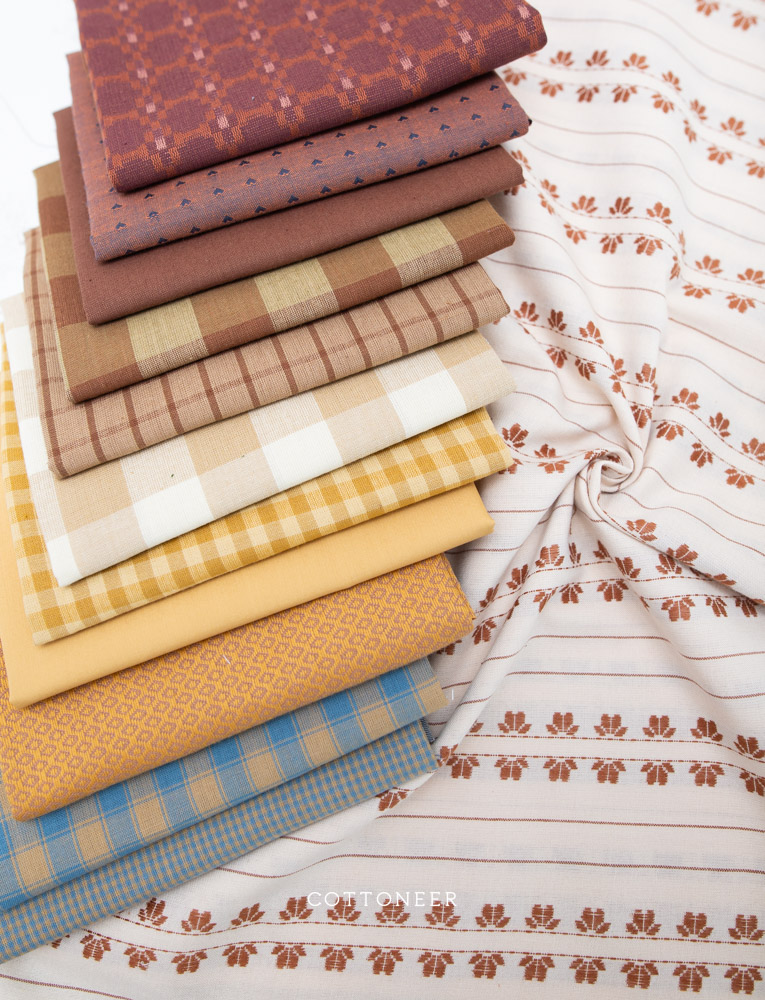 Our Pasture Living Bundle features a beautiful mix of woven fabrics in a gorgeous array of soft maroon, browns, golds, and blues! This bundle mixes 13 cotton fabrics to make a beautiful quilt or craft project full of great prints and texture! (Also good enough to leave on the shelf as eye candy for when inspiration strikes!) Make sure to check out all of our Cottoneer Bundles and other fabric bundles, available in fat quarters and yardage.